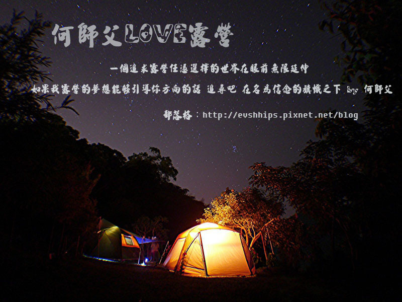 -何師父說:一個追求露營任憑選擇的世界在眼前無限延伸 如果我露營的夢想能夠引導你方向的話 追尋吧 在名為信念的旗幟之下。
