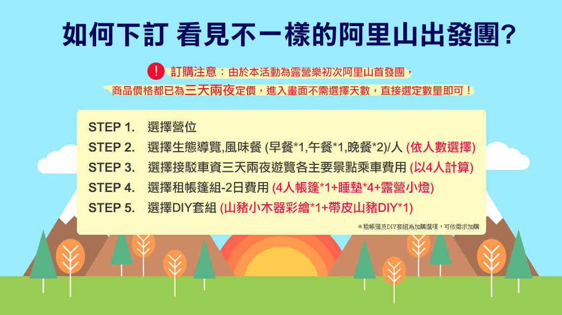 *訂購注意由於本活動為露營樂初次阿里山首發團,商品價格都已為三天兩夜定價,進入畫面不需選擇天數,直接選定數量即可!
