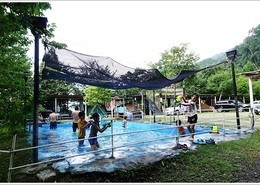 飯後依年齡層各自帶開,昨天顧著玩桌遊,荒廢了聊天,今天的女人們在怪獸天幕裡大聊特聊;我們聊得很開心,老天爺下雨也下得很起勁,沒多久就聽到屁孩已經呈現在水上地墊玩桌遊的消息,氣候達人的客廳整個淪陷,泡在水中,睡帳雖然沒有進水,不過裡頭的歡樂時光頓時成了水床,睡在上面還有噗啾噗啾的水感。在大家紛紛帶孩子進帳棚的當兒,這一家四口令人心疼地待在外頭待到好晚,老木還刻意地乾了一杯,就是圖著一進帳棚就能立馬昏睡,不想面對這一帳棚的悲壯(如果你想知道,這是草地區的26-28號營位)。