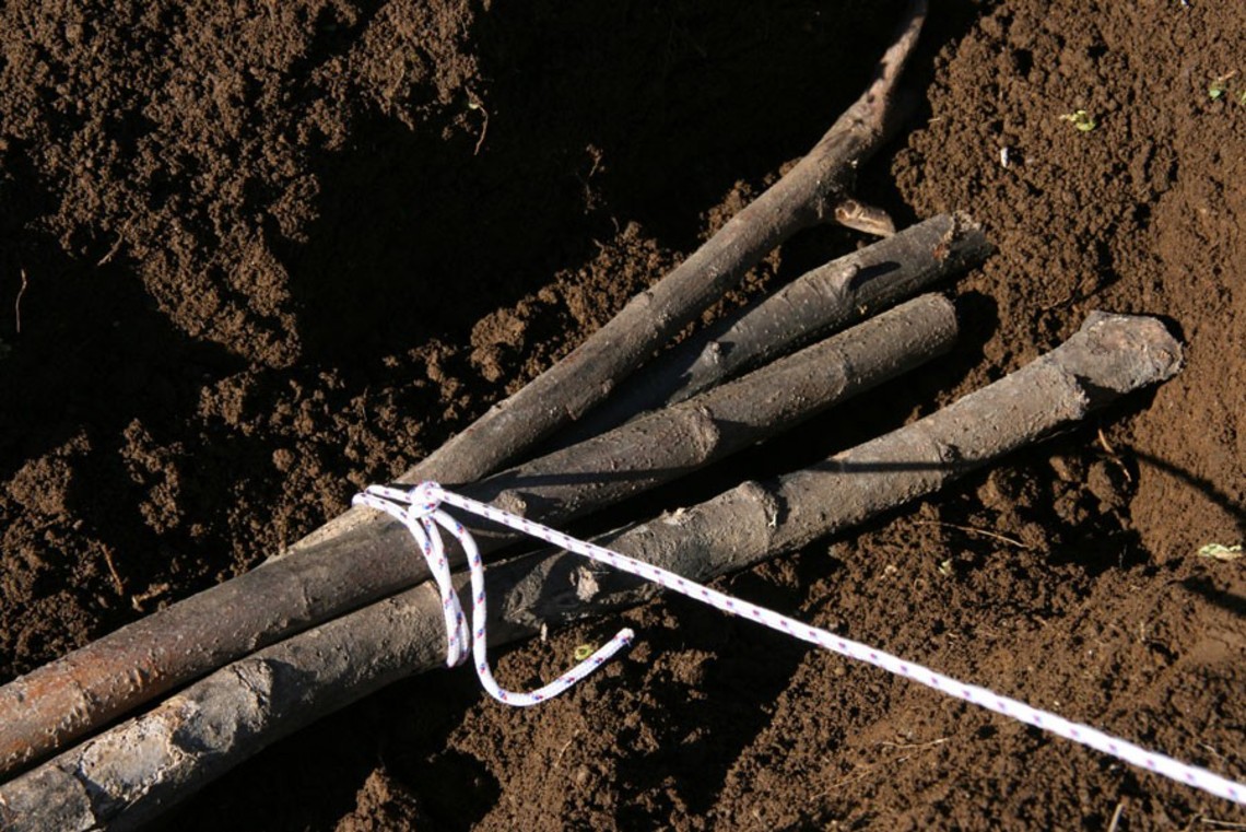砂地或是比較鬆軟的土地環境,可以利用樹枝成束後綁營繩,再將樹枝埋入地面。