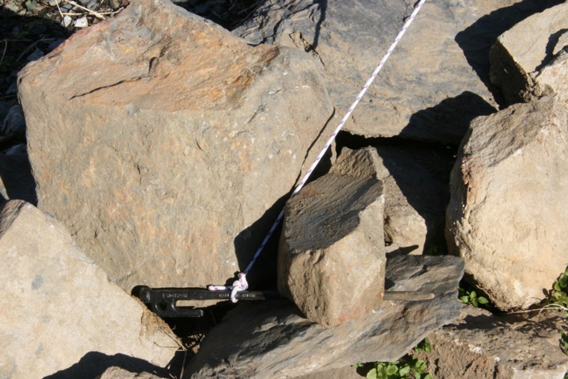 營繩直接綁在大塊巨石或是將營釘利用石塊壓住。