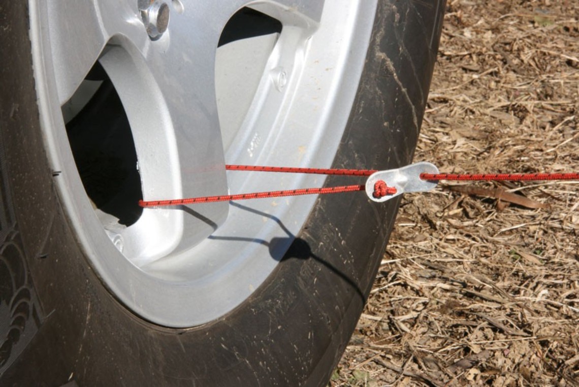 直接將營繩綁在樹或是車輪框。不過記得車子移動前要將營繩拆下來呦!