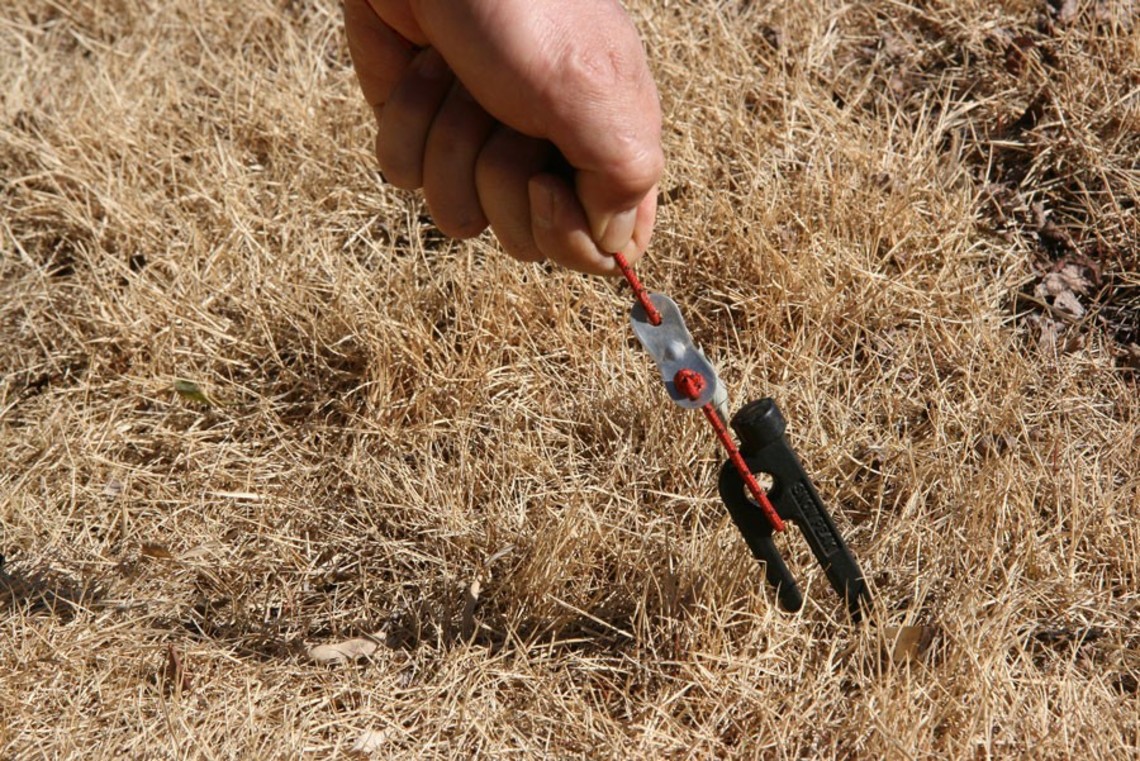 草地或是柔軟的地面可以直接將營繩拉撐後垂直拔出。