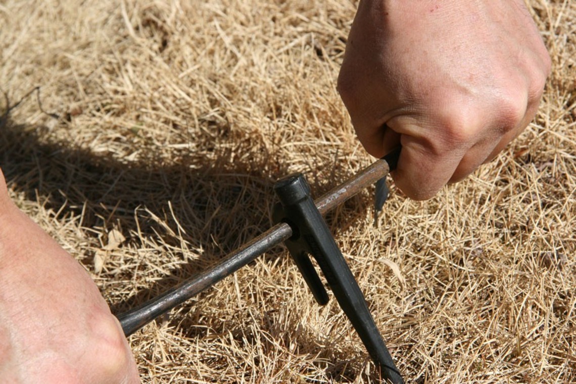 將變形的營釘放在堅硬的石頭或水泥地上,利用營鎚將歪曲的部分打直。也可以利用尖嘴鉗修復。但已經變形的營釘穩固度等其實都不堪用了,最好當作應急處理,及早購入新品替換。