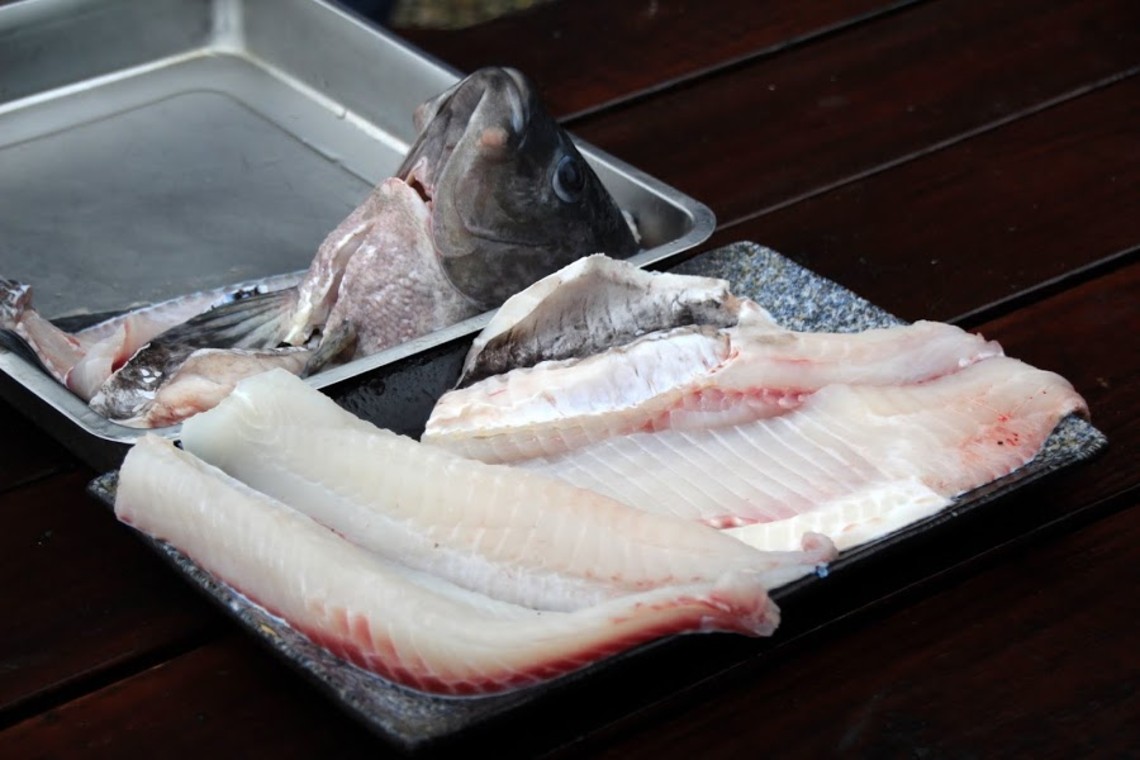 這隻超過兩斤重的尖石鯛,經過主廚細膩的刀工一一拆解,屆時將依肉質局部特性,做成生魚片、握壽司、火烤魚、麻辣魚及海鮮涮魚片等
