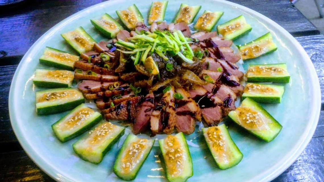 熱油煎過的鴨胸肉,外皮酥脆、肉質軟嫩,外圍成圈的味噌小黃瓜則是味道清爽,兩者搭著一起吃,在味噌與芝麻韻味的催化下,齒頰留香回味無窮