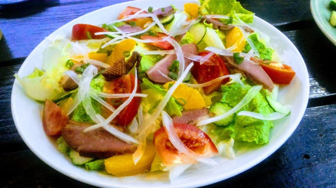 簡單的洋蔥絲、牛番茄片、小黃瓜片及生菜等拌勻,再加入幾片熱油煎過的鴨胸肉片,立即讓原本的涼拌菜升級為熟沙拉