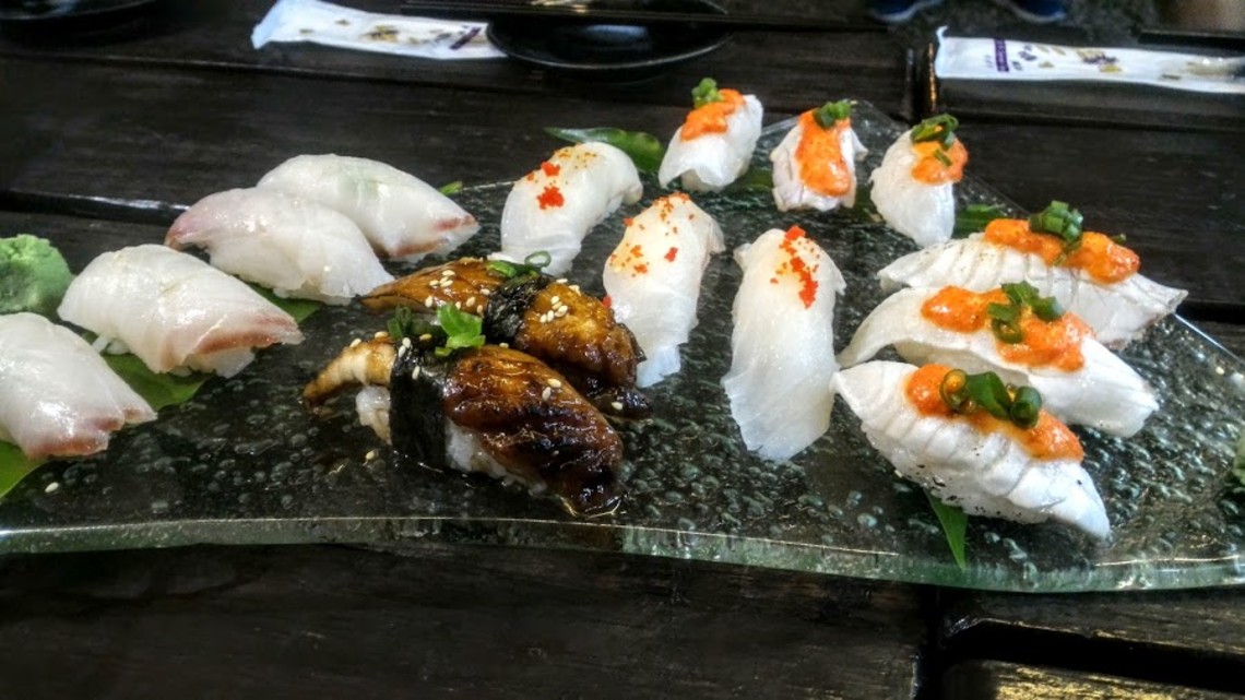 尖石鯛捏成的握壽司,QQ的肉質搭上醋飯的口感,開動後沒多久就一掃而空,坐在遠處的夥伴僅能望物興嘆了