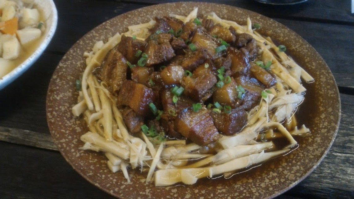 桂竹筍口感甜脆、肉角焢肉味道迷人,這道在地桂竹筍焢肉(Ali 焢肉)一出,竟然讓一鍋白飯瞬間見底