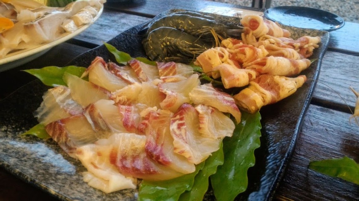 尖石鯛的各個部位有不同的吃法,這盤鯛魚片火鍋配料明顯與生魚片的部位有所不同