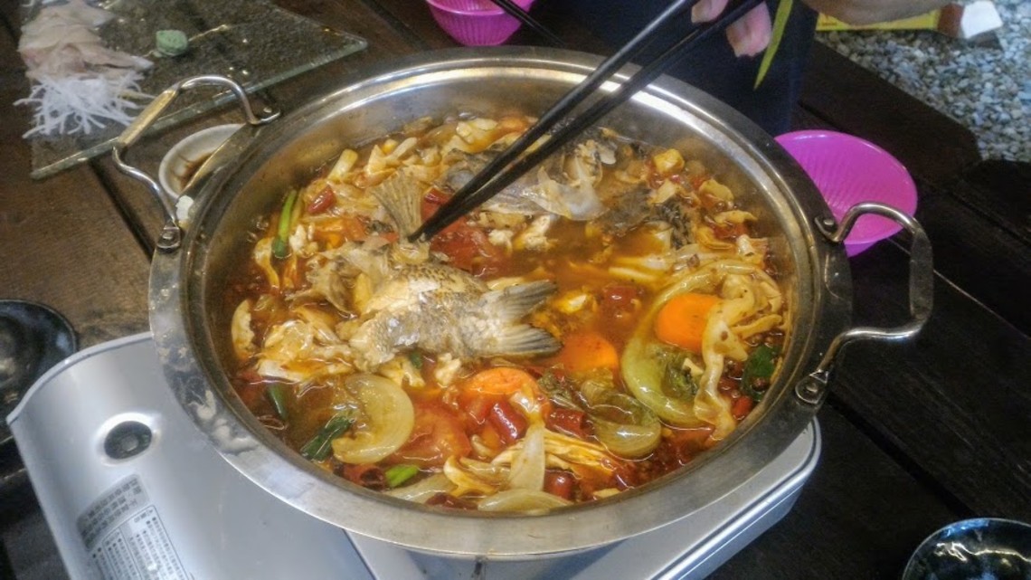 這鍋最後上菜的蜀辣川菜烤魚麻辣鍋,因大夥各個的肚子已完全滿載了,故未使用大型烤盤裝盛,但依然不減其嗆辣香味