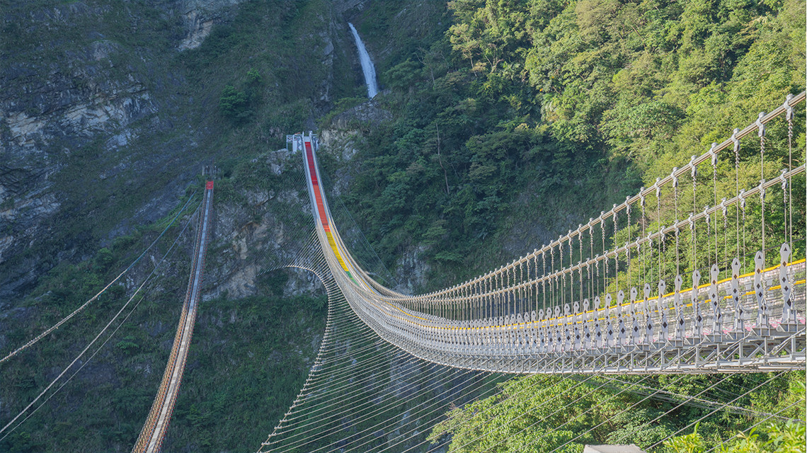 距離達瑪巒文化藝術團開車只要10分鐘,就可以抵達雙龍瀑布七彩吊橋剪票口停車場。雙龍瀑布七彩吊橋自2020年開放,全長342公尺、離河谷最深可達110公尺,為全台最高、最深的高空七彩吊橋。壯闊山谷地景搭配完善的環形步道與景觀平台,讓到訪旅客無不為美麗的山景、高空漫步享受森林呼吸的行程,留下深刻印象。