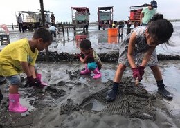 吃了美食我們準備上國道南下彰化二林、芳苑,我帶著孩子來到芳苑安排採蚵文化行程:坐海牛車、鐵牛車、找潮間帶生物、採蚵、挖蛤蠣、體驗插竹子做蚵架、現吃蛤蠣鮮湯、現烤
